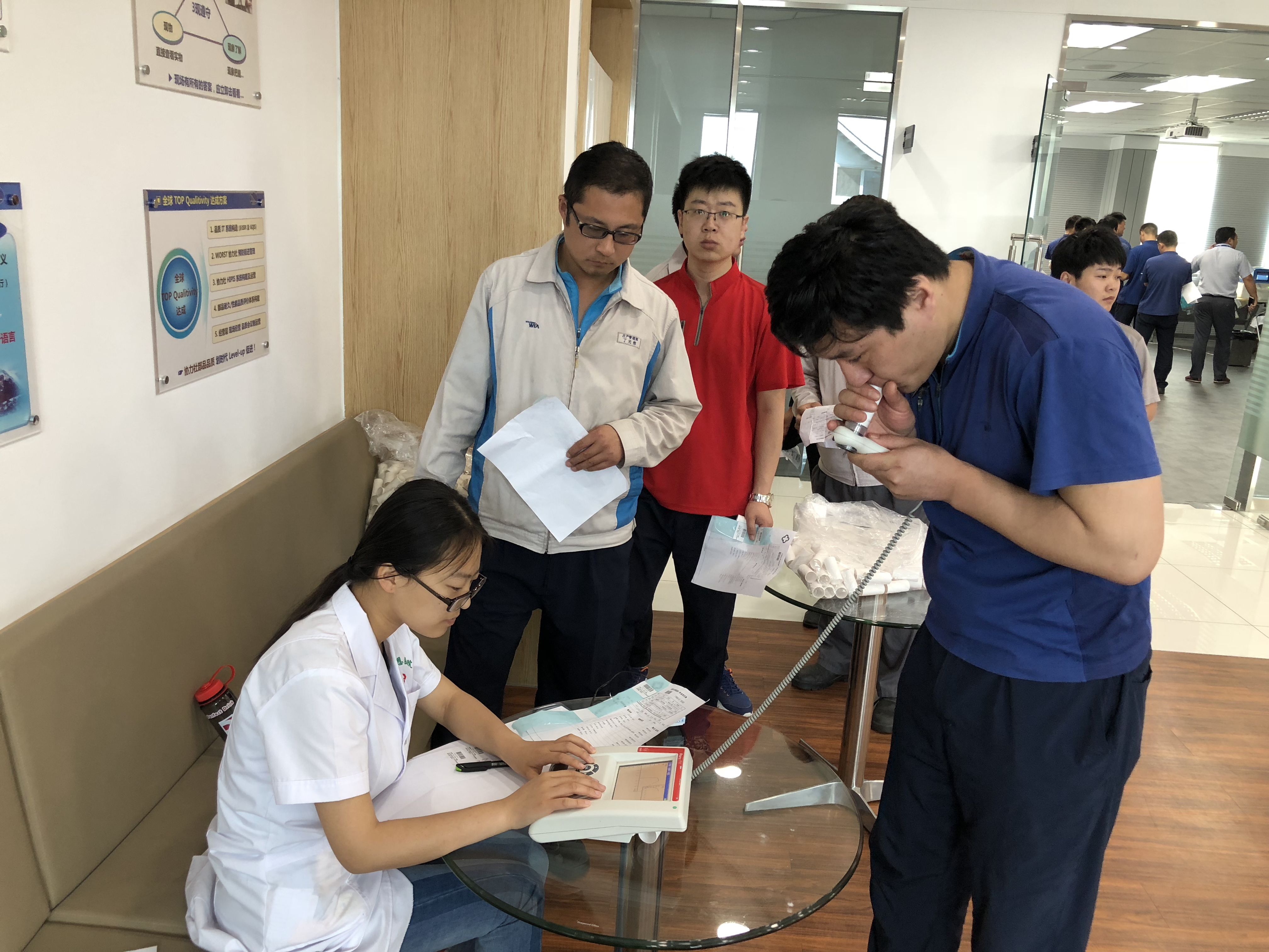 此次体检活动分为职业健康体检与一般健康体检,一般健康体检又分为40岁以下男社员体检与40岁以上男社员、女社员、韩国技术者体检,将体检类型进行更细的划分,可以在满足社员体检的要求下,减少体检造成浪费。为了达到更好的体检效果,同时针对我公司存在的噪声、粉尘、高温等职业健康危害因素,此次职业健康体检项目安排了常规检查(身高、体重、血压、视力等)、乙肝五项、肝功、肾功、血糖、血脂、血常规、尿常规、心电图、腹部彩超、胸片、肺功能和电测听等13项检查项目。为了节约职工时间,职业健康体检地点设在公司内,同时餐厅将早餐时间延长至10点,班车也将发车时间延长到10点,保证职工在体检完后可以吃到早餐,可以做公车回家。在各部门的大力配合下,整个职业健康体检过程井然有序、规范合理。在40岁以下生产职进行职业健康体检后,公司将于6月20~22日之间组织进行一般体检。